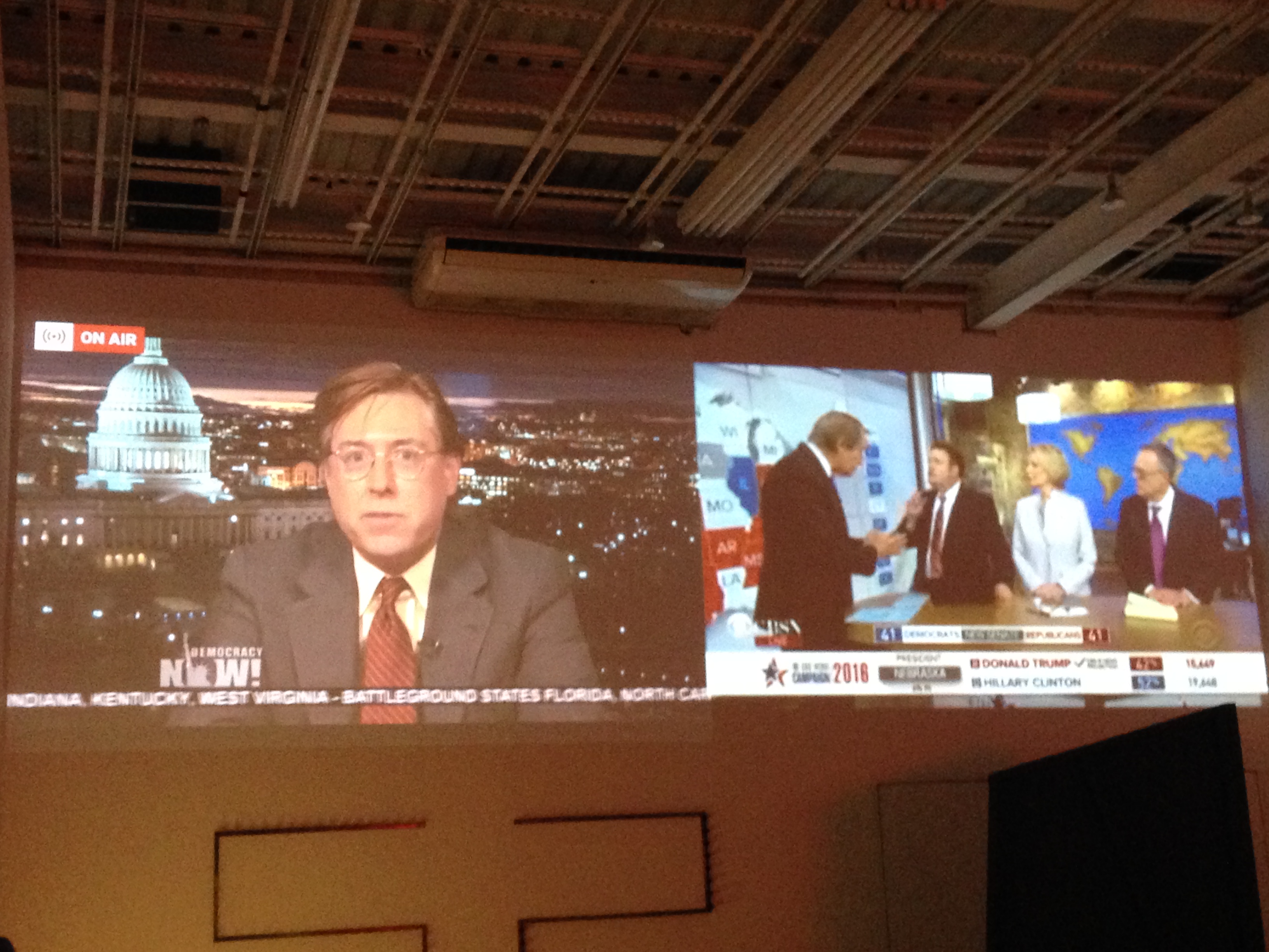 Se ponía la cosa naranja-oscuro-casiTrump al mismo tiempo que Álvaro, con el que estaba guassapeándome y que retransmitía en directo las elecciones para la revista digital CTXT me decía, ponte “Democracy Now”, que han llevado a la flor y nata de la intelligentsia progresista. “Democracy Now” es el medio alternativo por antonomasia de EEUU, refugio de Sanderistas y de los movimientos civiles americanos. Está capitaneado por Amy Goodman, que yo sospecho duerme en un plegatín debajo de la mesa del plató porque la tía es omnipresente. Así que fui a la cabina de los platos y le dije, pínchate a la Goodman. Martha, apenada, me dijo que no tenían banda ancha suficiente pero que iba a probar… y voilá: