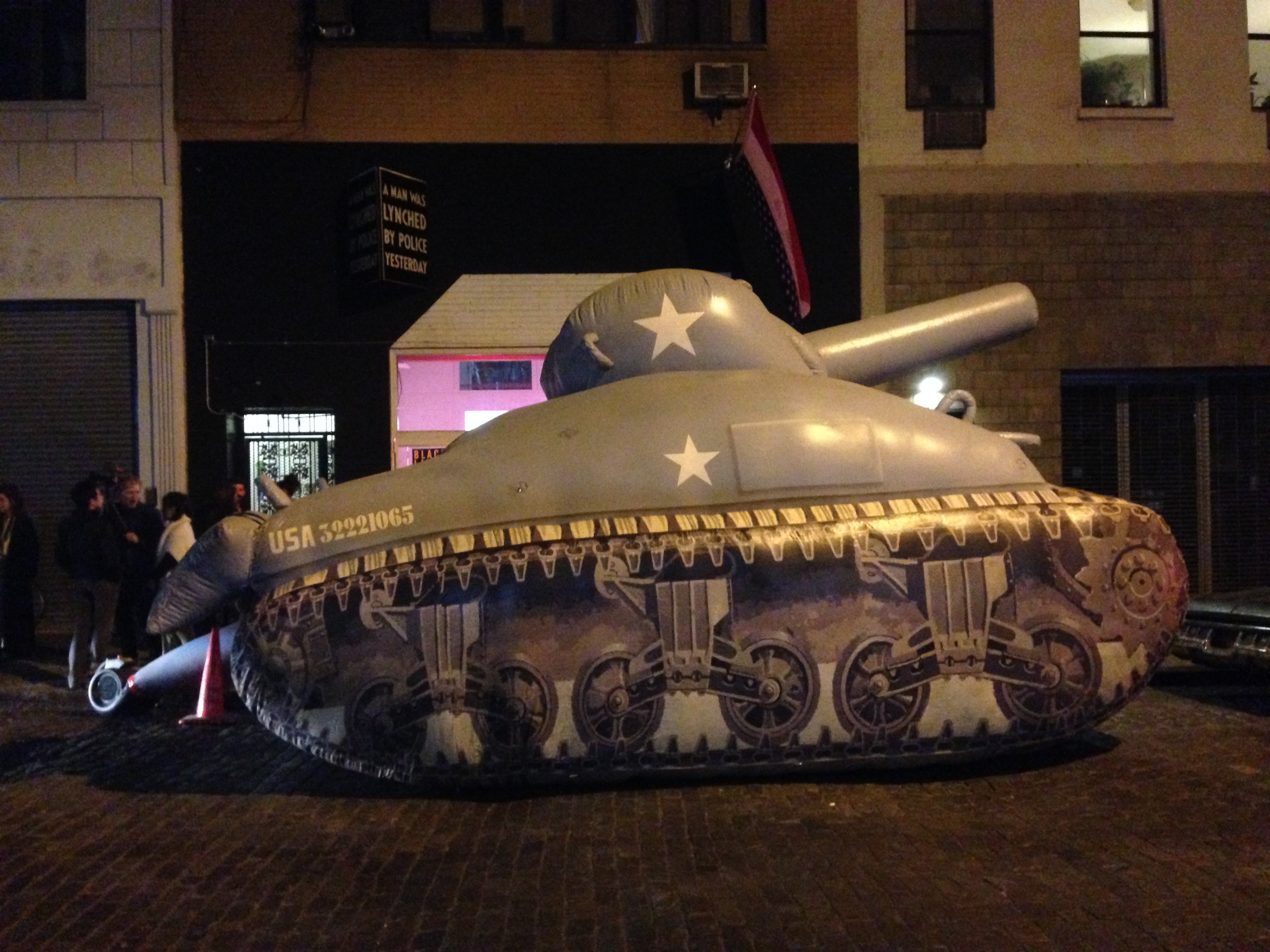 Pero volvamos al día de D, al día del pato D. La misteriosa Camila Cañeque me invitó a un evento de artisteo en una galería del Lower East Side que conjugaba performance y elecciones, sin más pistas. ¿Qué hace usted Sr. Buñuel con la Velvet?, me decía mi amiga Elisabet Mainez cuando lo leyó por facebook. La política tiene extraños compañeros de cama pensé. Cuando llegamos allí lo primero que vimos fue esto, tanqueta a estribor: